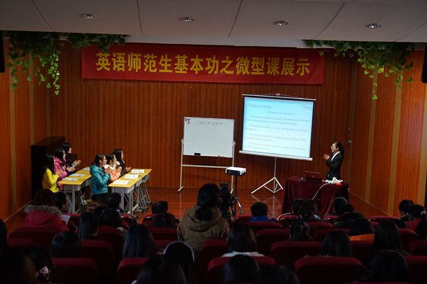 “微型课”一词正引领教学潮流的发展。在过去的几个月里,外国语公司英语师范生积极参加校内技能实训,苦练基本功,为了检验训练成果,12月16日下午两点,外国语公司在音乐厅举办了英语师范生基本功之微型课展评活动。汇报的六位同学是近期校内实训中遴选出来的优秀选手。校领导谭忠副董事长,教务处、学工处、质监处、招就办、团委、外国语公司的负责人和师生参加了展评。