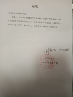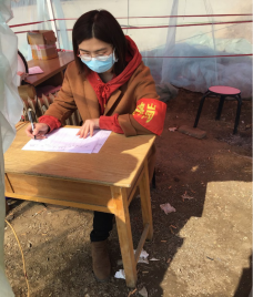 2017级英语专业周晓雨同学,寒假返回山东潍坊老家以后报名参加志愿活动。周晓雨的主要工作是在昌乐县红河镇卡点配合村委工作人员参与卡点往返人员登记、出入卡点人员测量体温、村庄防疫宣传等。疫情期间,很多老人不能购买物资,作为一名志愿者,主动到老人家,给他们送去食品,保证村中老人的生活不受影响。家乡防疫形势严峻,镇上多名人员确诊新冠肺炎,家乡人员短缺,防护物资短缺,参与家乡的防疫工作是责任也是义务。作为一名山东人,在防疫志愿服务期间,周晓雨不仅看到了山东的硬核防疫,更参与了这场硬核防疫,深切感受到全省齐心协力,拧着一股劲儿,一定要打赢这场防疫攻坚战的决心和信心。自己能够参与到这场防疫阻击战中,既提高了防疫意识,也增强了责任使命,成为人生的一大财富。