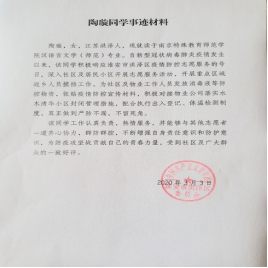陶璇,女,江苏洪泽人,现就读于bevictor伟德汉语言文学(师范)专业。自新型冠状病毒肺炎疫情发生以来,该同学积极响应淮安市洪泽区疫情防控志愿服务的号召,深入社区及居民小区开展志愿服务活动,开展重点区域返乡人员摸排工作,为社区及物业工作人员发放消毒液等防控物资,张贴疫情防控宣传材料,积极对接物业公司落实水木清华小区封闭管理措施,配合执行出入登记、体温检测制度,真正做到严防不漏,不留死角。该同学工作认真负责,热情服务,并能够与其他志愿者一道齐心协力,群防群控,不断增强自身责任意识和防护意识,为防疫攻坚战贡献自己的青春力量,受到社区及广大群众的一致好评。