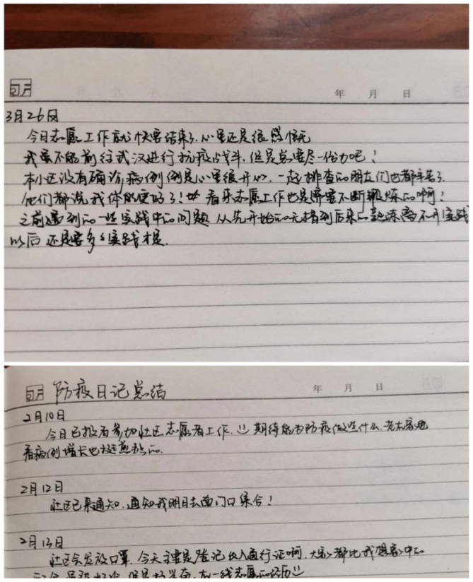 在疫情防控期间,她经常写日记,做总结。这种认真严谨的工作态度和敢吃苦的精神都得到了社区工作人员的称赞。她在日记里写道,“我虽然不能战斗在疫情一线,但我也要尽力为家乡防疫工作贡献一份力量。”(文/各志愿者、孟庆庆  图/各志愿者)