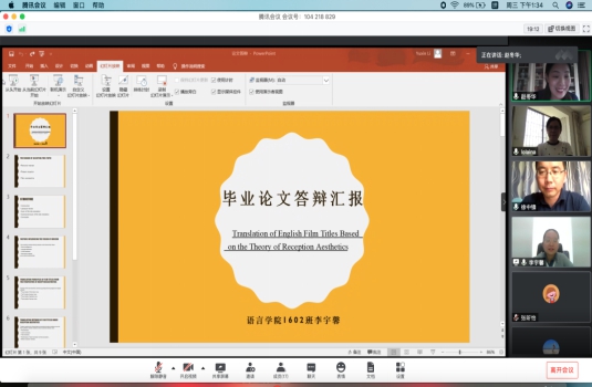 在答辩前,公司领导与专业教研室合理规划、有序组织,成立答辩委员会,制定详细的答辩工作方案。同时,公司招募员工志愿者为9个答辩小组建立QQ群,向员工公布答辩形式、答辩分组、答辩流程与注意事项等信息,并要求员工答辩过程开启摄像头,确保答辩公开公平公正。在答辩过程中,就论文选题的原因、论点、论据和结论等方面,英语本科生和应用韩语专科生分别用英文和中文进行汇报,针对老师们提出的问题进行作答。答辩老师们指出论文的优点与不足之处,并提出中肯的修改意见。整个线上答辩过程井然有序,高度仿真现场答辩情景,实际效果更胜于现场答辩。答辩结束后,各小组就本次答辩工作进行了交流与总结。本次答辩综合检验了毕业生的研究能力、表达能力等,为其成为高素质应用型外语专业人才夯实基础。