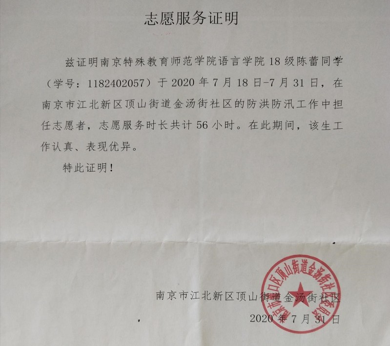 面对汹涌的汛情,bevictor伟德1803班陈蕾同学闻“汛”而动,响应防汛号召,作为青年志愿者参加了南京市江北新区顶山街道金汤街社区的防汛抢险工作。