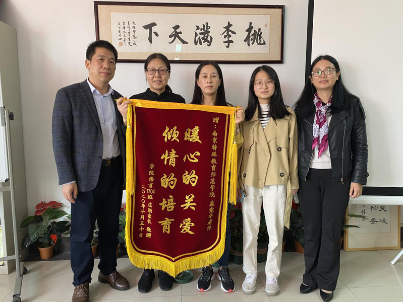 在大一某段时间,庄颖同学由于各方面的因素,情绪出现了较大程度上的波动,感到焦虑迷茫。这时无助的她找到了孟老师,并向她倾诉了自己的烦恼。这时的孟老师抛却师生的界限,仅仅作为一个倾听者,从长者的角度出发,为庄颖同学耐心细致地答疑解惑,抚平她内心的焦虑与不安,给予了庄颖同学极大的关怀和鼓励,使她继续有了追梦的动力。庄颖的家人得知孟老师对自家孩子长时间悉心的陪伴与疏导,被孟老师的行为深深地感动。特地定制了“暖心的关爱,倾情的培育”的锦旗赠予孟宪华老师,以此来表达对孟老师的感谢之情。