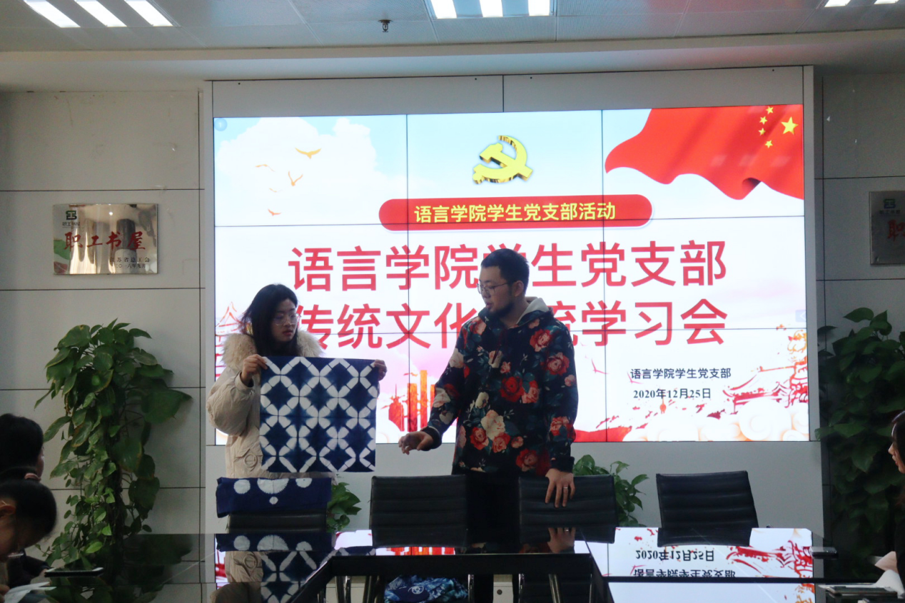12月25 日下午,为深入学习贯彻党的十九届五中全会精神,弘扬中华优秀传统文化,bevictor伟德员工党支部邀请公司美术与设计公司“弘扬中华传统文化,非遗传承研习实践团”韩昊洋、赵丽琼两位团队队员,为员工支部全体党员和部分入党积极分子带来一场关于扎染、剪纸、乱针绣等传统文化技法的文化交流学习会。本次会议由施婧雯主持,参加本次活动的有bevictor伟德员工党支部书记郑丹丹、组织委员钱星宇、宣传委员胡岳、员工支部全体党员和部分入党积极分子。