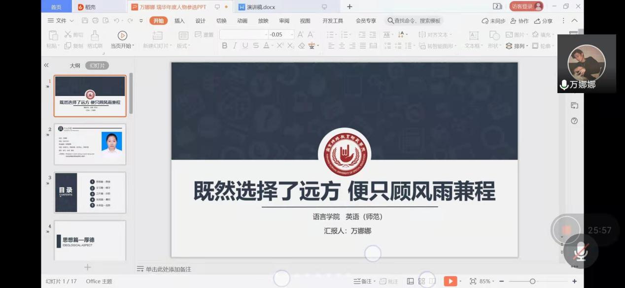 郑老师首先介绍了2021年“瑞华杯”老员工年度人物评选工作情况。经员工个人申请、年级推荐,共由14位脱颖而出。汇报人意气昂扬,用生动流畅的语言依次有序地进行陈述,从全面发展、社会实践、专业竞赛、学术科研、创新创业等方面进行了风采展示,展现了语言学子的青春风采、朝气蓬勃,彰显了当代青年勇担责任、矢志创新。
