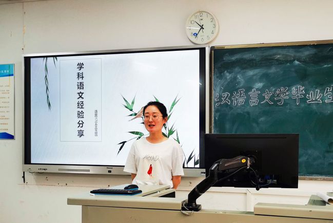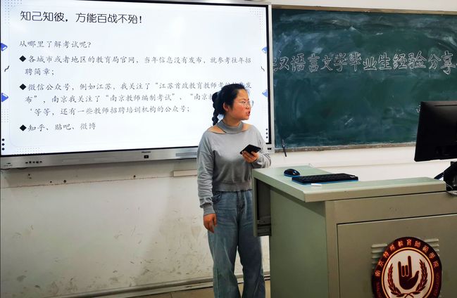 紧接着,考取了南京市江宁区语文教师编制的王晶晶同学上台向大家分享了她的考编经验。她从了解考编考试的地点和内容、考编笔试形式和考前准备、考编面试形式和面试前的准备以及面试时的着装打扮和态度等方面向大家分享了她的考编经验。考试内容由笔试和面试组成,笔试分为教育综合知识卷和学科知识(小学语文)卷,而面试则需考编生们说课或者试讲以及答辩,更加结构化。最后,她强调了一定要让同学们抓住每一个机会来锻炼自己,畏难地向前进。