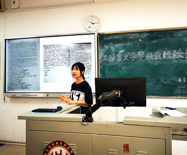 首先是考取了浙江师范大学汉语言文字学专业研究生的蔡陈慧同学向大家分享她的备战考研经验。她向大家讲述了考研常识问题方面的解答、择校问题方面的答疑、考研日历的具体内容、考研英语和政治高分备考经验、专业课内容方面的安排以及考研心态上的调整方式。她提出,考研是个体力活,考研的最根本定律是“听课+看书+理解知识点并记忆+大量刷题+整理错题+查漏补缺=取得好成绩”;而她认为考研生们应该相信自己,真正的学霸高手其实并不多,考研生们只要肯吃苦肯努力也必定会有所成;最后她劝诫同学们不仅要仰望星空,还要脚踏实地,争取在将来取得好成绩。