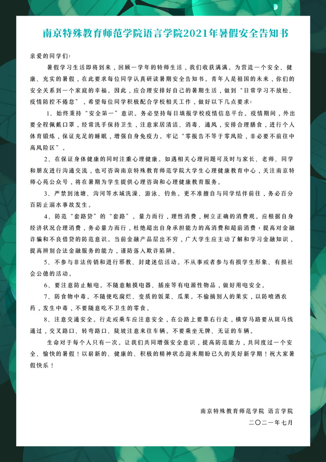 安全教育一直以来都是公司员工工作中最看重的一项工作,此次走访抽查旨在提高同学们对离校安全和假期安全的重视,同学们也应该树立高度的安全意识,做到时时讲安全,事事讲安全,度过一个安全、愉快、健康且充实的暑假。(郑丹丹)