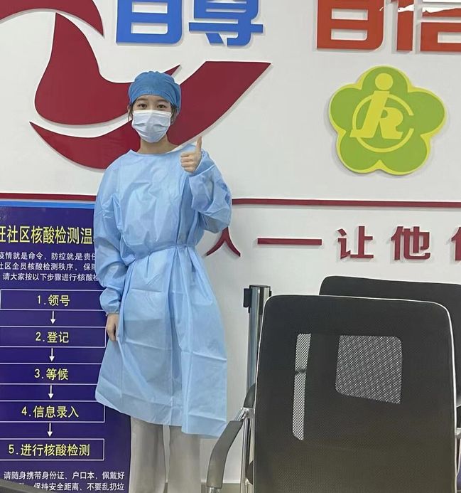 同样是南京菇凉的语言1903班万娜娜同学,在7月中下旬第一时间申请加入志愿服务,但因不满疫苗接种两针要求而未被审批。后南京开放疫苗接种后,她再次申请参加一线志愿工作,终于在8月11日正式上岗,负责泰康仙林鼓楼医院入院的体温测量、核酸检测以及挂号缴费服务等工作,志愿时长长达二十多个小时。长时间的站立、防护服的闷热都没有使她退缩,而是一直以热情的态度、细微的服务来引导检测的有序开展,坚持为群众带来最好的服务。