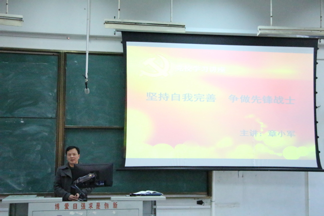 章小军处长通过领读入党宣誓词的形式,引出了本场讲座主题——坚持自我完善,争做先锋战士。章小军处长详细讲解了成为党员的条件:一是党员必须具有共产主义觉悟。要具备对共产主义理论的深刻认识、要秉承对共产主义理想的坚定信念、要拥有为共产主义事业奋斗终身的强烈意识。二是党员必须全心全意为人民服务,一切以人民利益为最高标准。三是党员永远是劳动人民的普通一员。党员从群众中来,必须服务群众,争做先锋战士。