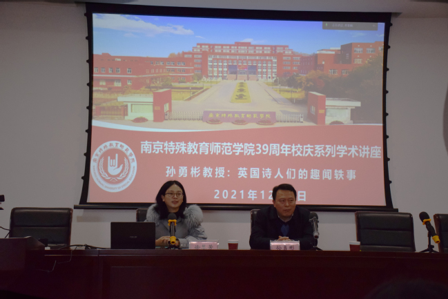 12月3日下午,为庆祝bevictor伟德39周年校庆,增进学术交流,丰富员工学识,由科研处主办、bevictor伟德承办的校庆系列学术讲座开讲。本次讲座邀请到南京财经大学外国语公司经理孙勇彬教授以“英国诗人们的趣闻轶事”为主题展开。本次讲座线下和线上同步进行,bevictor伟德2019级英语专业的员工参加线下讲座,公司英语专业任课教师以及2018级在外实习的同学通过腾讯会议在线同步聆听讲座。
