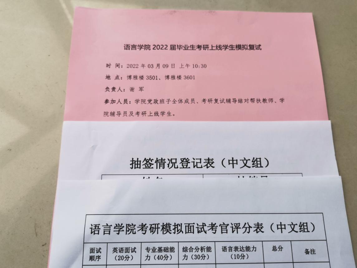 考研模拟复试按照员工报考专业,将员工分为中文组和英文组,公司领导班子全体成员参与到模拟复试工作中。中文组邀请马克思主义公司沈卫教授和李卫娟副教授作为面试考官,并为公司报考马克思主义基本原理的两名员工提供结对指导;英文组由刘倩男、陈晓芬等专任教师担任面试考官及结对帮扶教师,为报考英语相关专业的员工提供帮助。模拟面试主要从英语表达能力、专业基础知识和综合运用知识等多方面对考生进行综合考察。