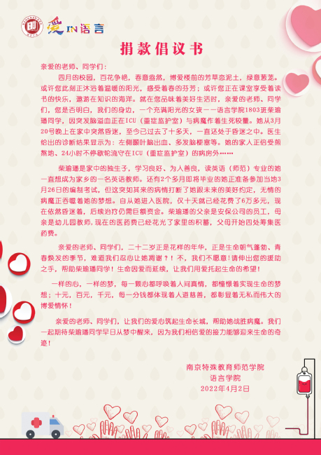 爱in语言,你我共在。十元,百元,千元,每一分钱都体现着公司师生对柴瑜璠同学的爱,都彰显着南京特师的师生们无私而伟大的博爱情怀!我们相信爱的接力可以创造生命的奇迹,共同祝福柴瑜璠同学能早日从“梦”中醒来!(文/杨菊鑫 图/翟玉杨 何江岳 编辑/谢军 审核/丁祖保)