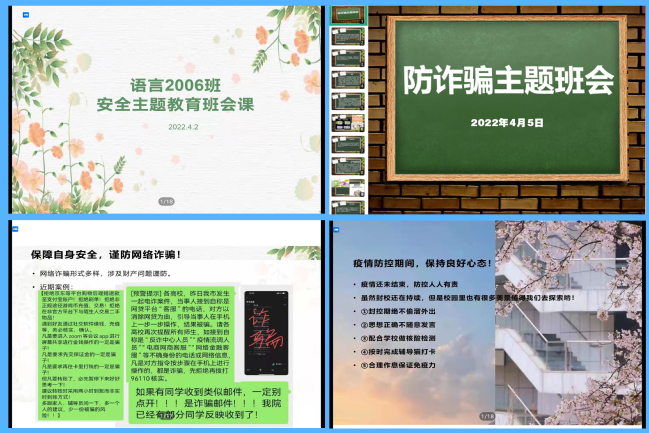 班主任老师们还结合近期高校间发生诈骗案例,警示全体员工提高反诈意识,并且要求员工党员、班干部和宿舍长发挥起班级“防诈宣传员”的作用,发现身边的同学接到疑似诈骗电话、信息时应该提高警惕,及时上报给辅导员和班主任老师协助解决。