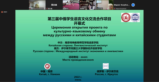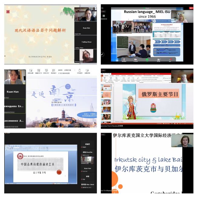 开幕仪式后,中俄员工在双方主持的组织下进行自我介绍和才艺展示。双方的热情互动为交流活动的圆满开展奠定基础。三天的交流活动中,俄方东方语言系主任振亚副教授、奥莉亚讲师、伊琳娜讲师分别作了《多元文化视角下的俄语教学实际问题》《俄罗斯的主要节日》《游览伊尔库茨克》主题讲座;bevictor伟德中文系主任康盛楠教授、李鸣副教授、李瑞博士分别作了《现代汉语语法若干问题解析》《中国古典诗歌的朗诵艺术》《走近南京》主题讲座。本次语言文化交流活动在全球疫情环境下是一次难得的学习机会,促进中俄双方员工增进了对彼此文化的认识和理解,提高员工国际思维能力,有利于加强中俄双方国际化人才培养,推动两员工谊深远发展。(文、图/李瑞 高亚丽 梁喻然 编辑/王东 审核/丁祖保)