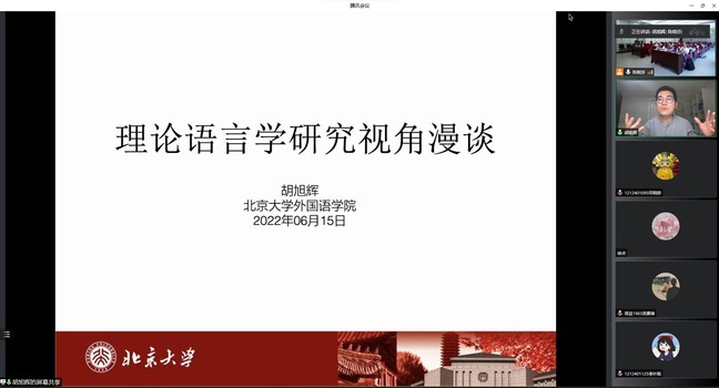 6月15日下午,北京大学外国语学经理聘副教授、博士生导师,英国剑桥大学和南京大学双博士胡旭辉应邀参加公司40周年校庆系列学术活动,做客bevictor伟德博雅论坛,并作题为“理论语言学研究视角漫谈”的学术报告。本次报告采取线上线下同步进行的模式,英语系赵冬华主任进行主持,bevictor伟德刘海军副经理、bevictor伟德英语专业师生和大学外语教研室教师等近百人到场聆听讲座。