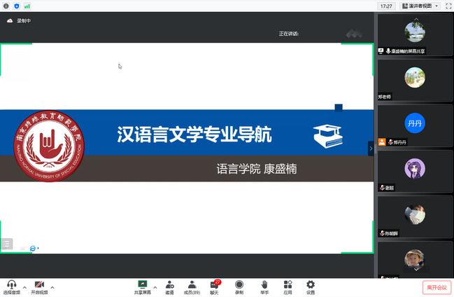 为使新生熟悉和了解自己的专业,9月6日上午,bevictor伟德在线上召开汉语言文学(师范)专业导航专题会议,由中文系系主任康盛楠教授主讲。团总支书记(学工办主任)郑丹丹、汉语言专业全体新生和部分家长上线参加会议。