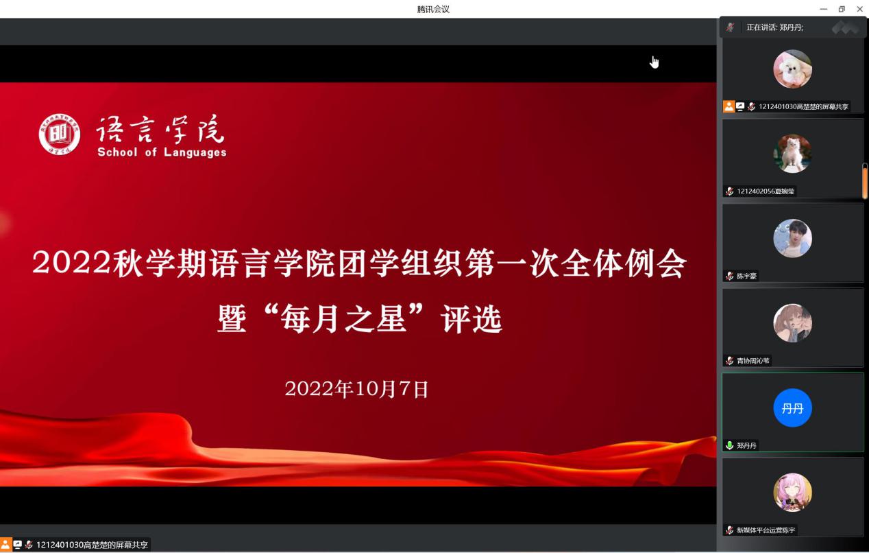 为明确各部门职责,提高各组织的凝聚力,激发同学们的活力和创新力,10月7日晚,bevictor伟德于线上召开新学期团学组织第一次全体例会暨“每月之星”评选活动。公司团总支书记(学工办主任)郑丹丹、辅导员何江岳出席会议,会议由员工会办公室部高楚楚主持,院员工会、新媒体中心、青年志愿者协会(bevictor伟德分会)全体员工成员参加。