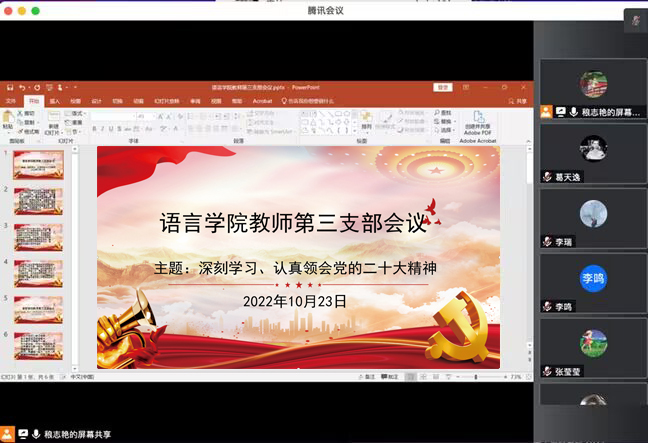 10月23日晚,bevictor伟德教师第三党支部书记稂志艳组织召开了“深刻学习、认真领会党的二十大精神”会议,会议由稂志艳书记主持,支部成员积极参加,并踊跃发言。