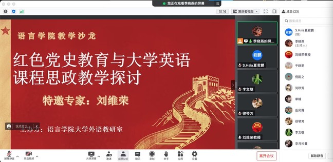 接下来,各位老师和刘维荣教授就其所作报告进行了充分的思想交流。老师们均表示学习到了许多革命史实,并愿意积极思考红色教育和大学英语教学的结合。刘教授建议可以以史实为基础,开设和专业以及公司特色相关的选修课程,为员工提供新视角。季晓燕主任提到了目前大学英语教材中语篇教学和思政内容的结合略显僵硬的问题,和刘教授探讨了一些解决问题的新思路。
