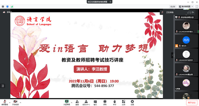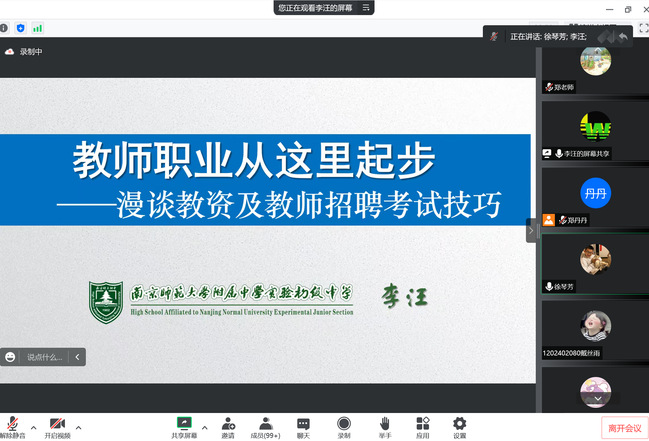 11月6日晚,bevictor伟德特邀南京师范大学附属中学实验初中副董事长李汪教授开展教资及教师招聘考试技巧线上讲座。本次讲座由团总支书记(学工办主任)郑丹丹担任主持,副经理徐琴芳、公司党总支副书记张冬冬,bevictor伟德大三、大四员工积极参加。