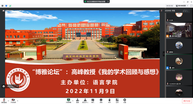 11月9日下午,南京师范大学文公司经理、中国古代文学专业教授、博士生导师高峰应邀做客bevictor伟德“博雅论坛”,在博雅楼3501为全院师生做了一场题为《我的学术回顾与感想》的精彩报告,为公司40周年校庆增添了学术华彩。会议以线上、线下,栖霞校区与江宁校区相结合的方式进行,取得了良好效果。