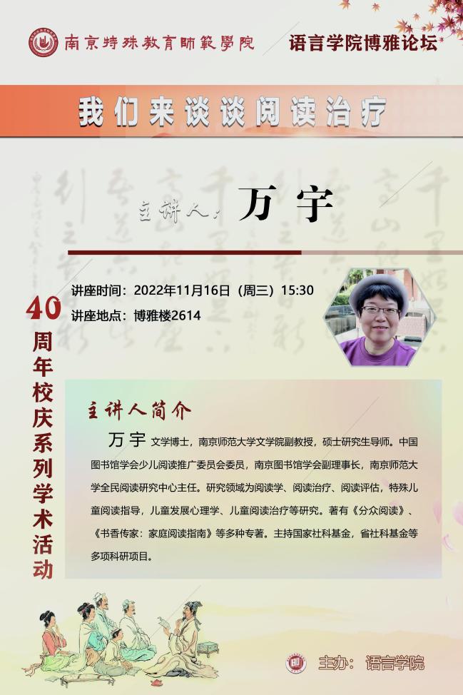 【学术预告】11月16日 万宇 《我们来谈谈阅读治疗》
