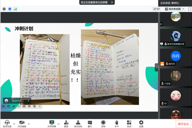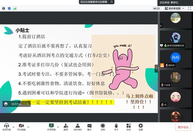 景李红同学以自身考取北京林业大学翻译硕士英语笔译专业的经验,分享了考研的具体规划与复习方法,建议学弟学妹们在后期认真复习政治,稳住英语水平,并且多次复习巩固专业课程的知识点。景李红同学强调,备考时要保持良好的心态,正确对待焦虑的心情,寻求合适的缓解焦虑的办法。同时,景李红同学还列出了一些考研小贴士,涉及衣食住行等各个方面,让考研学子感受到了慰藉与安心,对未来的考研准备有了更明晰的方向。