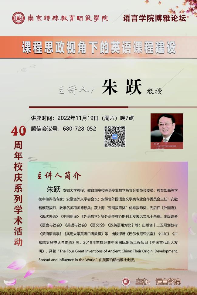 【学术预告】11月19日 朱跃 《课程思政视角下的英语课程建设》
