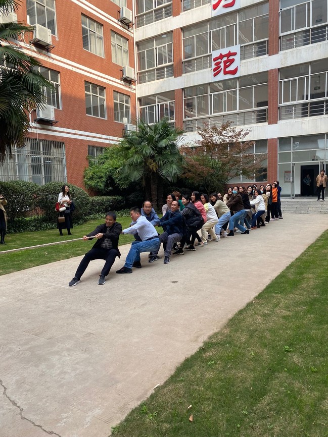 裁判哨声还未吹响,对阵双方的教师就已经压低重心,蓄势待发,摆好了拔河的姿势,准备迎战。哨声一响,老师们立刻咬紧牙关、向后倾倒,双手紧握长绳,铆足了劲拼命往后拉。谁也不甘落后,谁也不让谁。老师们赛场上的努力程度绝对不亚于在工作岗位上体现出的奋力拼搏。赛场外的教师们也不甘示弱,加油声一阵高过一阵。最后英文教师代表队以2:1的成绩战胜了中文教师代表队。