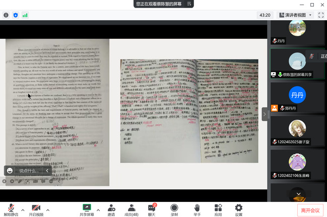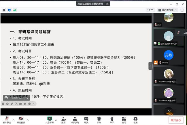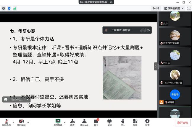 会议伊始,郑丹丹老师介绍了本次会议的主要内容并表达了对参会员工的期望。她提出,希望即将面临考研的同学们能够直面困难、全力以赴,也希望所有参会员工可以在此次会议中交流经验,相互促进。之后,蔡陈慧学姐根据自己一“战”上岸浙江师范大学汉语言文字学专业的经验,和同学们分享了考研常识,涉及多个细节如报名时间、考试科目等等。随后,她建议同学们提高信息搜集能力,向同学们推荐了择校的权威网站及途径,并展示了自己的考研日历。她还结合自身经验做了有关考研英语、政治高分备考经验的分享,尤其提到了有助于提分的刷题卷和真题卷,帮助同学们获得了优质备考资料。最后,蔡学姐嘱咐同学们要保持良好的心态,加强锻炼、相信自己,不仅要仰望星空,还要脚踏实地地学习。