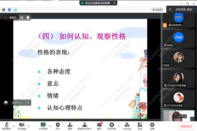 会议伊始,徐花教授从心理发展阶段指出老员工正处于青春期与成年早期的过渡期,面临建立自我同一性、进行个人成长与探索建立亲密关系的挑战。同时,徐花教授运用实操经验推断了老员工所处的恋爱阶段。接着,徐花教授从什么是爱情谈起,向同学们普及了爱情在生物学上的意义,并且引用了海伦菲希尔的理论,说明了爱情的三个阶段:性欲,吸引力,依恋。与同学们一起探讨如何建立自己的恋爱观。徐花教授还从如何看待“感觉”、如何协调金钱观、如何觉察家庭因素、如何认识观察性格四个方面提出了一些建议。