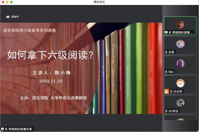 讲座伊始,陈小梅老师直入主题,对英语六级阅读的命题特点、做题顺序、做题策略等进行了详细介绍。她以历年大学英语六级考题为例,分析大学英语六级阅读的具体题型设置,交流基本解题思路,开展针对性阅读训练,在线上与员工们积极互动,边做题边巩固边拓展,通过反复演练帮助员工们掌握英语阅读解题所需的做题技能,拓展了员工们的解题思路。同学们在讲座结束时纷纷表示了对老师的感谢,感慨受益匪浅。最后,季晓燕主任鼓励同学们积极备考、科学复习,以平常心迎接六级考试。