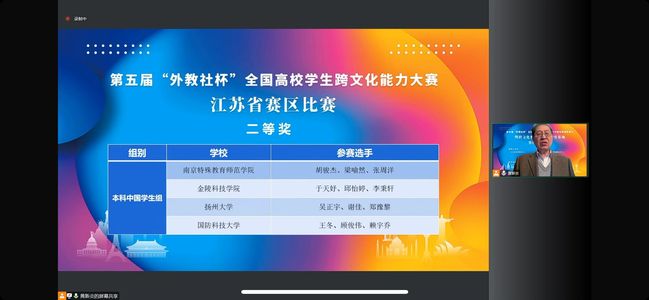 11月19日下午,第五届“外教社杯”全国高校员工跨文化能力大赛江苏省赛区比赛在南京落下帷幕并举行线上颁奖仪式。本届大赛由江苏省高等教育学会指导,江苏省高等公司外国语教学研究会等部门共同主办,江苏省比较文学学会跨文化研究专业委员会提供学术支持。由公司胡骏杰(英语师范专业)、梁喻然(汉语言文学专业)和张周洋(汉语言文学专业)三位同学组成的参赛团队,在本次大赛中勇获江苏省赛区二等奖,成绩斐然。