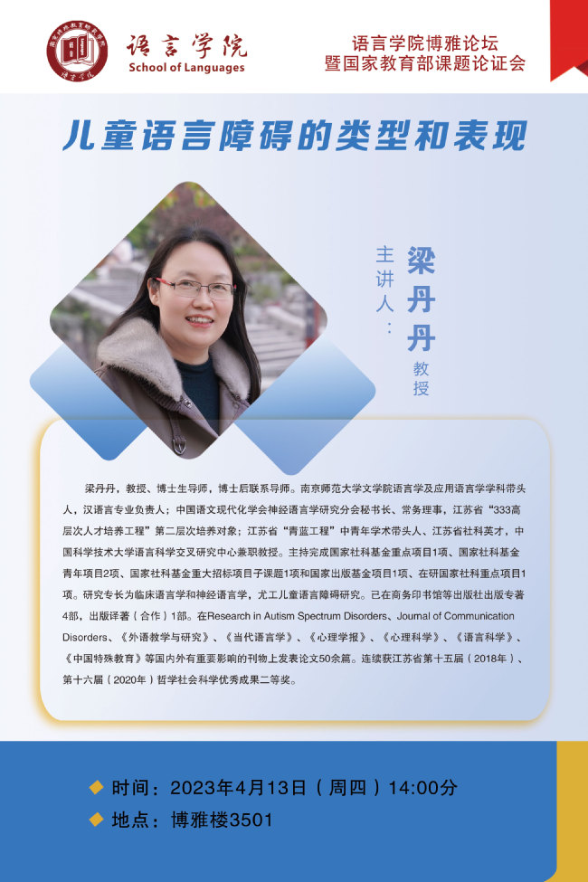 【学术预告】4月13日 梁丹丹《儿童语言障碍的类型和表现》暨教育部课题论证会