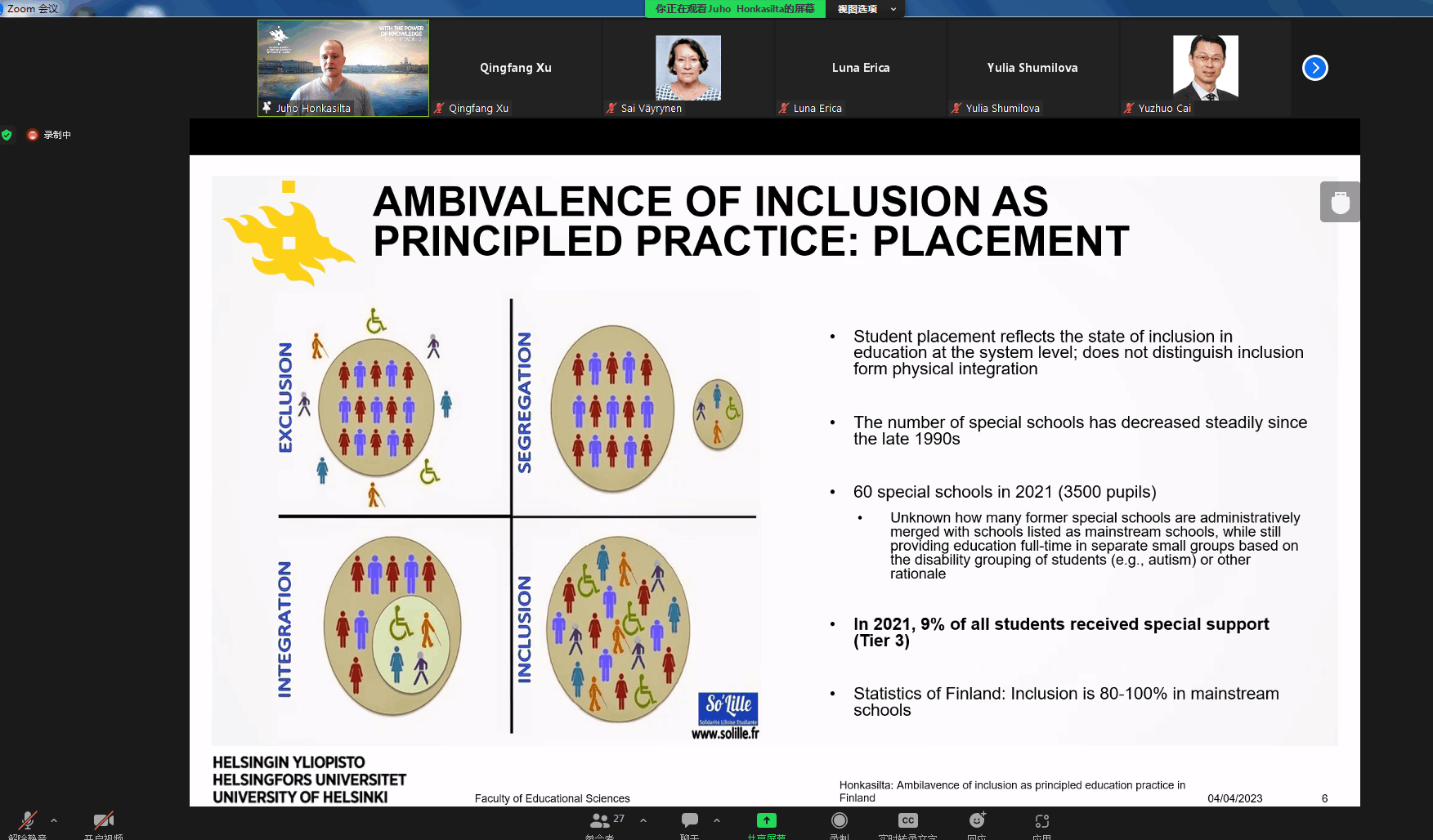 第二部分由芬兰学者Juho Honkasilta报告,他主要提出无论是在经济、社会还是政治上,残疾儿童在政策制定中经常被忽视,剥夺了他们在日常生活中实现平等的机会。融合教育努力弥合这一差距,并使全世界约2.4亿残疾儿童获得与其他儿童一样的教育机会。他还重点介绍了芬兰融合教育的模式和课程标准,近年来在特殊公司就读的员工减少,80%的特需员工进入普通公司就读,这些给融合教育的发展带来了挑战。