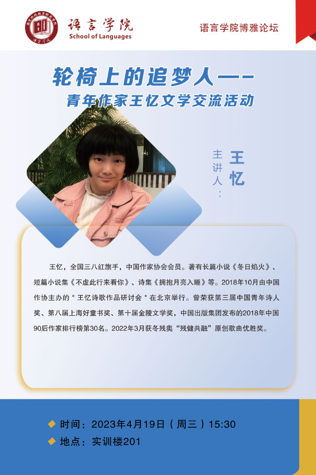 交流活动:4月19日 青年作家王忆 《轮椅上的追梦人》