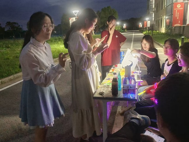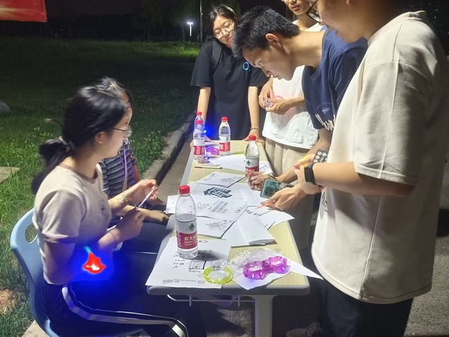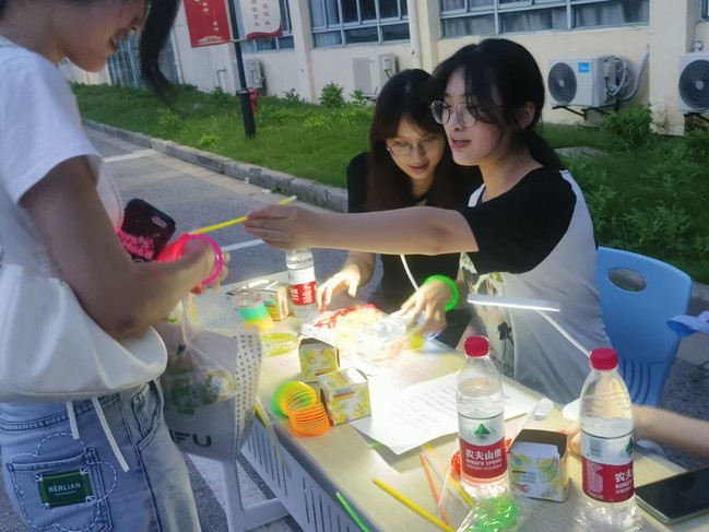 本次荧光夜活动主要是采用趣味游戏的形式,在同学们日常生活必经之地设游戏点,小花园、综合楼、食堂、宿舍等都在其中。游戏内容结合公司专业的特点,以英语单词、中文汉字为题目来源,采用团队打卡积分的方式,围绕文字展开,有字谜游戏,单词拼写游戏等等,在玩中学、在学中思。同学们积极参与,聚在一起有说有笑,讨论着答案。不久,就有同学过五关、斩六将,完成了游戏闯关。同学们利用手中的积分卡兑换礼品,荧光棒、悠悠球、荧光手环等小物件绽放出点点荧光,在漆黑的夜晚照亮了江宁校区。活动结束后,大家满载而归。