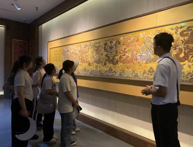 跟随讲解员的脚步,同学们来到“云锦天衣”展览馆,近距离观赏光彩夺目的服饰与云锦作品。通过清晰的图片与专业的讲解,同学们全方位了解了库缎、织金、库锦与妆花等不同的云锦品种,追溯南京云锦的发展历史。大型的织机模型显现出云锦织造工艺的复杂与精细;蓝地龙莲妆花缎、龙袍、马褂等布料与服装透露出云锦的精秀与华贵。队员们一边观赏古代店铺与秦淮河沿岸场景,一边回顾金陵织造业的兴盛与流迁,在万寿中华图与九龙图中感受云锦的魅力与文化的力量。