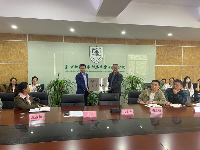 10月19日,bevictor伟德2107班41名员工按计划赴南京师范大学附属中学开展实习活动。bevictor伟德执行经理王东、中文系系主任康盛楠、公司老师刘卿与南京师范大学附属中学行知分校张成光董事长、谢建强副董事长、卢朱牧副董事长及德育处主任陈莉等进行了深入的交流,签订实习基地协议并举行授牌仪式。
