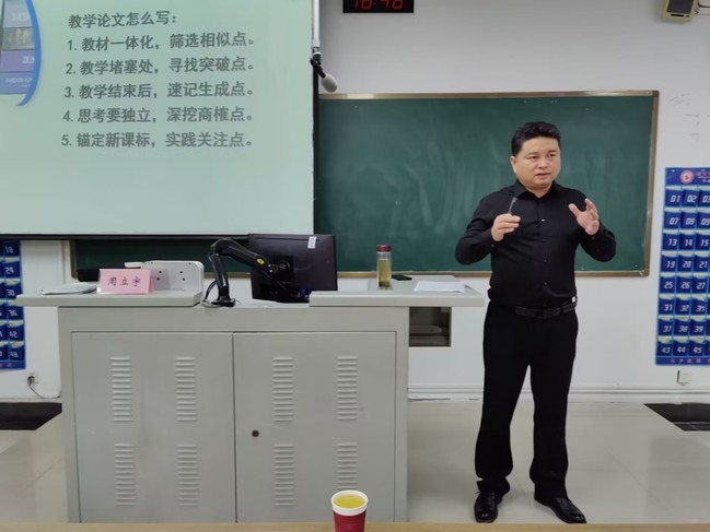 周老师还指出,课堂教学永远是论文写作的孵化器,并提出了五点有关教学论文的写作要求:一是教材一体化,筛选相似点;二是教学堵塞处,寻找突破点;三是教学结束后,速记生成点;四是思考要独立,深挖商榷点;五是锚定新课标,实践关注点。讲座最后,周老师分享了他的援疆支教经历,希望每一位员工都要做一名有家国情怀的教师。一系列动情的回忆与生动的阐释引发了在座师范生的动容。
