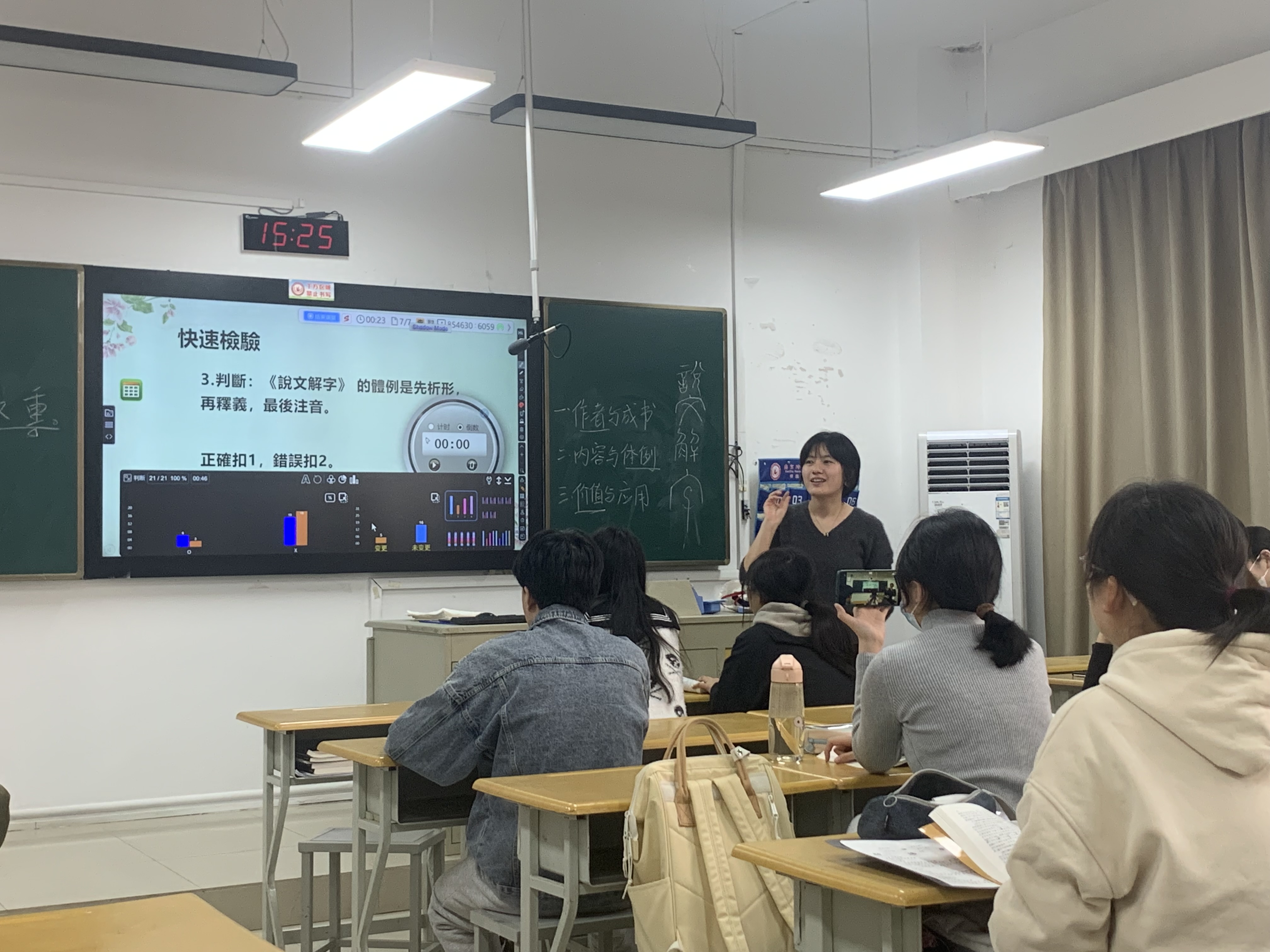本次教研活动首先由中文系语言学教学团队负责人李瑞老师进行了以《说文解字》为题的智慧教学公开课展示。李瑞老师结合课程教学目标及教学重难点,灵活运用了公司智慧教学平台即问即答、抢答、智慧挑人、计时、计分、统计图等互动功能,员工参与课堂的主动性和积极性得到显著提高。通过智慧教学平台数据通道、数据反馈、统计决策、关注员工、多元评价等模块的功能应用,李瑞老师即时收集学情,针对性调整授课进程及内容,展现了智慧课堂的高效性,使老师们体会到了智慧课堂对于教师精准教学和员工个性化学习的助力作用,也帮助老师们加深了对智慧教学的理解,深刻感受到了智慧课堂的应用实效。