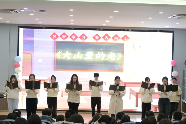 大会第五项是师范生才艺展示。2003班蔡依彤等员工带来了充满感情的诗歌朗通《大山里的光》;2002班李巧燕和张紫怡两位同学带来歌曲《奇迹再现》,展现了了两位同学的舞台艺术实践能力以及音乐表演力;2006班谢子旋、王冠程、王小文、梅鑫晨带来诗朗诵《初心》;2023级员工袁可欣怀着对学长学姐的美好祝愿,带来歌曲《不为谁而作的歌》。