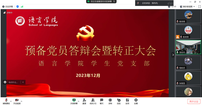 答辩环节完成后,胡骏杰等5位预备党员从思想、学习、生活、党性修养和先锋模范作用发挥等方面进行陈述,汇报了自己在预备党员期间的表现,总结回顾了在预备期一年间的成长、进步和不足之处,并对自身存在的不足之处提出了解决措施。入党介绍人根据对预备党员的了解、考察,综合各预备党员过去一年的表现,分别对胡骏杰等5位预备党员转正问题发表了意见。入党介绍人们均认为其在思想、学习、工作、生活等方面表现良好,能够发挥出党员先锋模范作用,同意其按期转正。其他与会的党员同志也对预备党员进行了审议。
