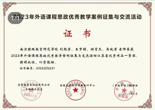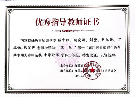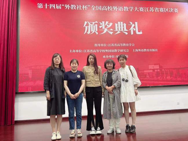 公司国丽芸老师获得第五届中华经典诵写讲大赛“诗教中国”诗词讲解大赛(大学教师组)全国一等奖;刘艳芳、王梦颖、谢育杰、吴晓芳等老师获外语课程思政优秀教学案例征集与交流活动江苏省优秀作品一等奖;丁祖保、刘艳芳、俞芳芳、王梦颖、赵冬华和徐中锋、姚晓菊、刘莹、常钰婧、徐琴芳两个团队连续荣获第十一届和第十二届江苏省师范生教学基本功大赛优秀指导教师奖;大学英语教师团队在第十四届“外教社杯”全国高校外语教学大赛江苏省决赛中斩获佳绩:孙昱、江枫和夏君鹏团队获大学英语视听说组一等奖(位列第一名)。