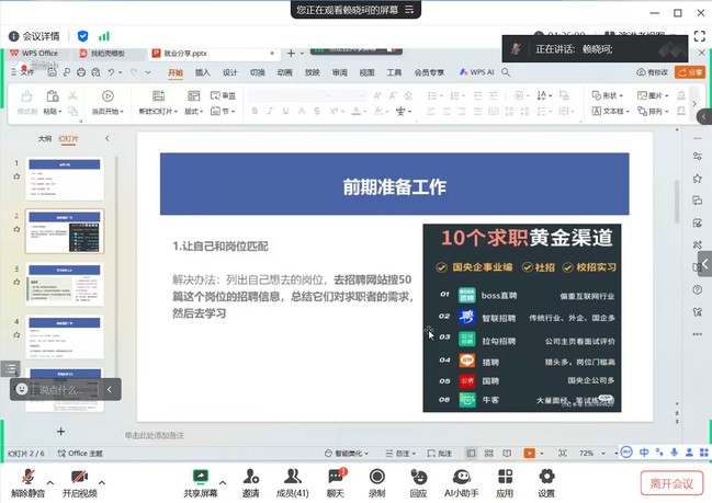 赖晓珂同学主要介绍了自己的本科实习经历,由于大二那年遇到“双减”政策,她便从大三开始转做自媒体去寻找新的出路。接着,她说明了自己的前期准备工作,指出自身能力要与岗位相匹配,也要计划周全,多备方案,随机应变。最后,赖学姐强调,一定要多投简历和多面试,并从中总结经验去运用到下一次面试中。
