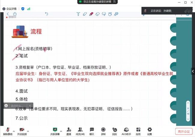 孙靖雯同学首先介绍了自己毕业前后的心态变化以及在大学时期为境外升学而努力的准备工作。但在当时社会环境下考研计划被打乱,她重新规划职业生涯,改变就业方向,转而去考公。她向同学们详细讲解了公考信息的获取方式、类型和流程,并结合自身经验提醒同学就业或多或少会遭遇迷茫,最重要的是需要稳住心态和保持一颗平常心。