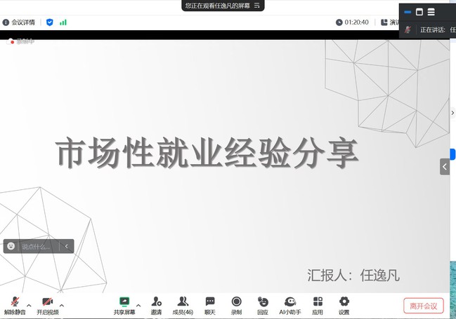 任逸凡同学分享了市场性就业经验,通过个人情况介绍,告诉同学们一定要在公司多多参加实践活动、考取相关资格证书和积累实习经验,这样才能在就业时更加适应岗位的要求。接着,任同学针对市场性就业途径展开论述,特别提醒同学们在面试不同的岗位时要针对岗位需求及时更新简历,提高就业可能性。她还阐述了市场性就业需要培养的工作能力,并强调,成功不是一蹴而就,而是需要一直为此努力。