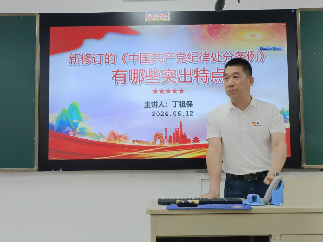 丁祖保书记以《新修订的〈中国共产党纪律处分条例〉有哪些突出特点》为题,为全公司党员教师讲授专题党课。本次授课围绕“党纪学习教育”和“恪守底线”两个关键词展开,丁祖保书记从“坚持思想引领,贯彻执行精神”“突出问题导向,坚决突出问题”“坚持与时俱进,总结经验规范”等多个方面深入讲解,启示广大党员要坚持正面引导和反面警示相结合,把铁的纪律转化为日常习惯。另外,丁祖保书记结合身边的警示教育案例,要求全体党员干部做到学纪、知纪、明纪、守纪,能够自我检视,警钟长鸣。