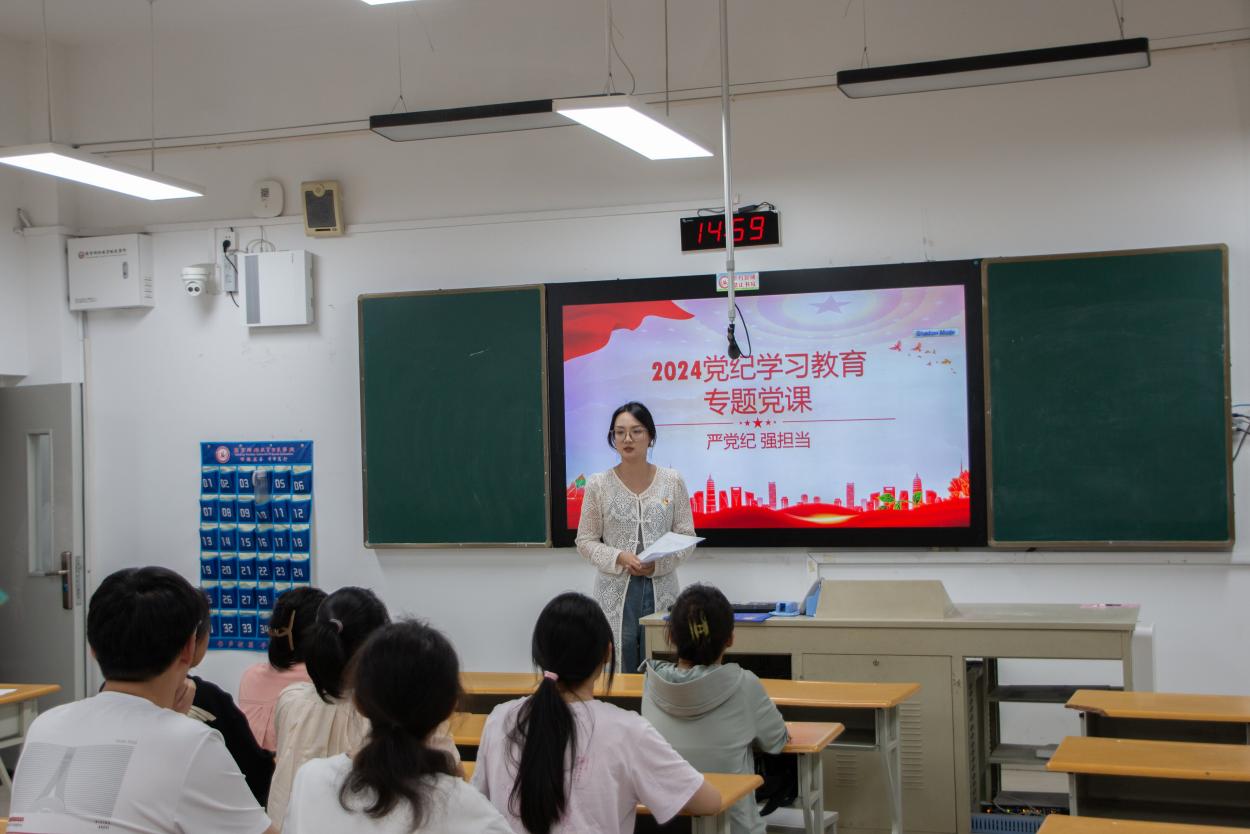 员工第二党支部书记翟玉杨以《严党纪 强担当》为授课主题,明确了本次党纪学习教育过程六个核心环节,特别是在阐述学习目标要求时,翟玉杨老师着重强调了“学纪、知纪、明纪、守纪”,要将党纪党规入心、入脑。她要求同学们对《中国共产党纪律处分条例》进行深入、系统地学习,严守规矩与纪律,树立良好的模范带头作用。